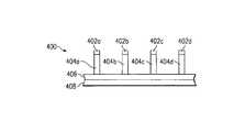 A dual-band IR photodetector400 according to a first embodiment of the present invention is illustrated in FIG.4 and can be formed from any of the various starting materials described above. The first embodiment is formed through a process comprising an etching step and a metal deposition step thereby fabricating the dual-band IR photodetector400. The etch process removes a portion of the top contact102 (FIG. 1) and the dual-bandIR absorbing layer104 down to thebottom contact406, resulting in top contact elements402a-c, and IR absorbing layer elements404a-c. The resulting width of the top contact elements402a-cand the dual-band IR absorbing layer elements404a-cis from 0.8 to 1.6 μm depending upon the two desired IR wavelength bands. Note that while top contact elements402a-cappear to be separate inFIG. 4, top contact elements402a-care electrically interconnected as shown inFIGS. 5 and 6. Thereflector408 is deposited on the side of thebottom contact406 opposite the etched portion. The fabrication process need not be conducted in this sequence.