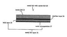 Subsequently after the formation of theinterface layer24, anickel bulk layer25 was formed on theinterface layer24. In a bulk-layer-forming tank26, electrolysis was carried out in a nickel sulfate solution containing 20 g/l of nickel, of which temperature was 40° C. and pH was 3, under the condition that the current density was 10 A/dm2. And thenickel bulk layer25, 2 μm thick was electrodeposited uniformly and even on the above interface while passing thecarrier foil21 through the metal-layer-formingtank9. Theanodes8 are arranged in the same manner as those of the first embodiment.