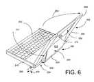 In order to operate themobile computing device200 in the laptop mode, thecover230 is pivoted from the device closed position as shown inFIGS. 3 and 4 to its laptop operation open position as illustrated inFIGS. 5 and 6. Thecover230 is generally rectangular in shape although other shapes may obviously be utilized, however, for the illustrated embodiment, a rectangular configuration is shown. Thecover230 includes aframe260 for carrying asuitable display screen262 located on theside264 of thecover230. It should be noted that theside264 is in a face-to-face relation with thekeyboard212 carried on the base unitoperational platform220 when thedevice200 is in its closed position. The upper end of thedisplay frame260 is generally designated266 and follows an arcuate path as indicated by thearcuate direction arrow268 when thecover230 is pivoted from the closed position to the open laptop operational position. Thecover230 pivots about therotation axis280 which extends transversely across the lowertransverse portion270 of thedisplay frame260. The plane of thesurface290 of thedisplay screen262 is continuously variable with respect to avertical axis282 to allow positioning of the display screen over a desiredrange284 of viewing angles with respect to a viewer generally designated286 and the surface25 of the base unitoperational platform220. As shown inFIG. 6, it is seen that theweb hinge assembly300 lifts from its nested position within therecess232 as thecover230 pivots about thefolding pivot axis310 andbase support axis320 while supporting thecover230. As illustrated inFIG. 7, thelower end portion270 of thedisplay frame260 is supported for rotation about theaxis280 by means of a suitable pin orprojection292 extending from thedisplay frame260 at eitherside294,296 of thedisplay frame260. Thepins292 provide support at bothlower sides294,296 of thedisplay frame260 and theweb hinge assembly300 provides support at a third point following along thefolding pivot axis310.