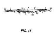 The depth (d) and radius (r) (r=½D) of the dimple may be measured as described in U.S. Pat. No. 4,729,861 (shown in FIG.15), the disclosure of which is incorporated by reference in its entirety. The dimple diameter is measured from the edges of the dimples, points E and F, alongstraight line162. Point J is the deepest part of thedimple12. The depth is measured from point K on the continuation of theperiphery41 to point J and is indicated byline164.Line164 is perpendicular toline162.