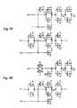 Power consumption of DFF inFIG. 10 will be described. Power consumption of a MOS circuit is generated by charging and discharging capacity which is added to a node of a push-pull circuit which is represented by an inverter and which comprises P type transistors and N type transistors. Capacity of the MOS circuit is mainly caused by channel capacity Cox which is generated between a gate oxide film and a channel. Here, simply, a switch circuit in which a gate is of low impedance (push-pull output) and an inverter circuit have the same load capacity Co. Therefore, load capacity that clock series Kin, ck, nck have to drive is 6Co, and power consumption P1 due to clock drive by a clock with a period T0is obtained by the following equation.