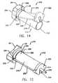 FIG. 12 also shows thatfront plates170 and172 includelatches192 and194, respectively, located at respective ends which are remote from or diametrically opposite from front plate pivot points188 and190.Latches192 and194 clamp onto the distal ends oftie rods184 and186 respectively, and are operable to fix thefront plates170 and172 in the closed position.Slots196 and198 are located nearlatches192 and194, respectively, and are conformable to pivotpoints188 and190, respectively, to permit a snug fit whenfront plates170 and172 are in a closed position.Front plates170 and172 may also include conical interior surfaces (not shown) that conform to the front of thesyringe154 when front plates are in a closed position.