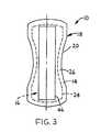 Referring still toFIGS. 1-3, theabsorbent core16 is shown having anouter periphery24. Thebodyside cover12 and thegarment side liner14 are secured or attached to theabsorbent core16 so as to form afringe26. Thefringe26 extends laterally outward from theabsorbent core16. Thefringe26 can extend partially or completely around theouter periphery24 of theabsorbent core16. Thefringe26 can be bifurcated or divided into a pair offringes26 each located on opposite sides of thecrotch portion20. Even when thefringe26 extends 360 degrees around theabsorbent core16, it can be viewed as having two portions that form a pair offringes26 located adjacent to thecrotch portion20. The pair offringes26 extends along at least a portion of the length of thecrotch portion20. The pair offringes26 can be identical in size and shape and will have a predetermined width measured along the y—y axis. From here on, theabsorbent article10 will be described as having a pair offringes26.