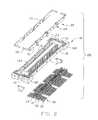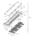 Please refer toFIGS. 2 and 3, thehousing10 includes abase18 and a mating portion extending upwardly from thebase18. The mating portion comprises a pair of parallellong sidewalls14 extending along a longitudinal direction of thehousing10 traversed by a pair of parallelshort end walls16 extending along a lateral direction of thehousing10 to define an elongated opening therebetween. The mating portion includes atongue12 located in a center of the opening, and the thickness of thetongue12 is larger than the thickness of thesidewalls14. Thetongue12 defines a plurality ofterminal channels124 along a top-to-bottom direction at two opposite outsides thereof, respectively. Thetongue12 further defines two rows offirst passageways122 therein. Thebase18 defines a plurality ofsecond passageways126. Thechannel124 andfirst passageway122 communicate with a samesecond passageway126. Thehousing10 further defines an L-shaped slot102 in each of four comers thereof, respectively.