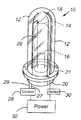 FIG. 2 further illustrates atemperature sensor26 which may be mounted directly to thebulb14, or may be secured to themount21 and positioned in the gap between theelement18 and thebulb14. Thesensor26 includes atransmission line27 which communicates with acontrol circuit28.Sensor26 acts as a temperature input to the control circuit. Theelement18 also electrically connects with thecontrol circuit28 as byelectrical line29. Thecontrol circuit28 would periodically energize/control theelement18 depending upon temperature inputs fromsensor26 to maintain thebulb14 at a desired temperature range. Acommon power supply32 can be used to power theultraviolet lamp14, as well as thecontrol circuit28 andheating element18.