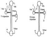 FIG. 1 is a schematic drawing showing the ‘T’ or ‘cross’ configurations for sample injection commonly used in LOC devices in common use.