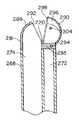 Referring toFIGS. 17-20, thedistal assembly222 according to a second embodiment of the invention includes astationary jaw281 coupled, preferably by adhesion bonding, to thedistal end268 of the tubular member. Thestationary jaw281, preferably made of plastic, includes ajaw cup288, an integralcentral clevis293 and integralproximal ramps295,296. Thejaw cup288 is located over theaspiration conduit274 and preferably has a blunt cutting surface orlip292. Thecentral clevis293 andproximal ramps295,296 extend from thestationary jaw281 and abut and partially cover the irrigation conduit. Amovable jaw290, preferably made of metal, is provided with asharp cutting edge298, defines twojaw holes302,304 for receiving apull wire220, and is provided with twobosses312,314 for mounting the jaw. Thebosses312,314 loosely engage thecentral lug293 and apivot pin294 extends through the bosses and the central lug. Theramps295,296 of thestationary jaw281 guide themovable jaw290 when opening and closing and assist to form a substantially fluidtight passage between themovable jaw290 and thestationary jaw cup288 when the jaws are in a closed position. A central portion of thepull wire220 which is perpendicular to the longitudinal axis of the instrument extends through the jaw holes302,304 and the ends of the pull wire extend into thecontrol conduits270,271. Turning back toFIG. 15, the Y-shapedcoupling tube223 facilitates alignment of the ends of thepull wire220 for coupling the pull wire to the proximal actuation handle. Thepull wire220 may be coated, e.g., in a plastic, to inhibit the pull wire from cutting into the tubular member.