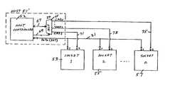 A modified system that makes it easier for individual addresses to be assigned to multiple cards, without having to change the cards' internal circuitry in any significant way, is illustrated inFIG. 4, where elements common with those ofFIGS. 1-3 are given the same reference numbers. Ahost51′ is similar to the host51 (FIG. 3) but includes acontroller52 that interfaces differently with the memory cards' command/response lines. Instead of a common command and response line being connected to pin2 of each of the sockets,separate lines71,73 and75 are connected to pin2 ofrespective sockets53,55 and57. Each of the separate command/response lines71,73 and75 is one output of switchinglogic65 which operates to switch a single command/response line67 of thecontroller52 among theindividual lines71,73 and75 in response to a control signal from the host in acircuit69. The permitted connections of the switchinglogic65 are shown inFIGS. 5A-D. The switchinglogic65 can select any one of the individual socket command/response lines71,73 or75 for connection by itself to theline67, as shown inFIGS. 5A-C, respectively. In any of these cases, signals pass in both directions through thelogic65 betweenline67 and the selected one of thelines71,73,75 etc. In another connection illustrated inFIG. 5D, all of thelines71,73,75 etc. are connected together to theline67 to enable the host to simultaneously broadcast commands to all card sockets. Thelogic65 preferably, however, allows only one card socket command/response line to be connected with theline67 at a time when the host is receiving responses from a card. Of course, although three individual socket command/response lines are illustrated, two such lines will be used if the system contains only two card sockets. If the system contains more than three card sockets, more than three command/response lines are used, one for each socket.