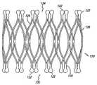 Referring toFIG. 22b, flattenedbulbous tails122 may replace the apices at the top130 end of at least more than onecell126 of thestent120 or prosthesis in order to minimize wear at the contact point between a stent and a corporeal lumen wall132 (FIG. 22c). In one embodiment, the top130 end of each of thecells126 and the bottom124 end of each of the cells within thestent120 includes a flattenedbulbous tail122.FIG. 22cdepicts the contact points between one embodiment of astent120 having flattenedbulbous tails122 and thecorporeal lumen wall132.FIG. 22bdepicts the flattenedbulbous tails122 at the bottom124 end and top130 end of thecells126 offset longitudinally such that only one half to the flattened bulbous tails occupy the same axial location when thestent120 is compressed for delivery.