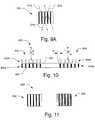 FIG. 10 shows a cross-sectional view of analignment target400 in accordance with another embodiment of the present invention.Alignment target400 includes two measurement locations, referred to asoverlay patterns402 and404. Each of theoverlay patterns402,404 includes a periodic pattern (402a,404a) on afirst element403 and a periodic pattern (402b,404b) on asecond element405. Theoverlay pattern402 has no designed in offset, i.e.,periodic patterns402aand402bare aligned whenelements403 and405 are in proper alignment.Overlay pattern404, however, has a designed in offset between the bottomperiodic pattern404aand404bof a magnitude D.