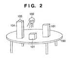Two stillreal objects101 and a movablereal object104 are placed on the table100. Since thereal objects101 are still, their locations and shapes can be input in advance. Since thereal object104 changes its location although its shape remains the same, it has alocation sensor103.