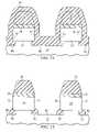 Recent studies have found that the prior method shown inFIGS. 1–4 yields a structure where theliner30 exerts stress on thesilicon24 at theinterface38 of thesilicon24 and theBOX layer22. Typically, such stress is highest at the edges of thesilicon24. The stress exerted on thesilicon24 may be upward along thesidewalls32 and compressive towards the channel region. This stress is believed to be caused by the thermal growth process for forming theoxide liners30 because the growth will occur in all directions, including vertically along thesilicon sidewalls32. As theoxide liners30 are grown (see e.g.,FIG. 2), the growth often extends into the BOX layer22 (at the interface of thesilicon24 and the BOX layer22). This may cause lifting of and/or lifting stress on thesilicon24 at the liner30 (i.e., at the edge of the silicon24). This is illustrated inFIG. 5. InFIG. 5, the silicon edge has been lifted and a “bird's beak”40 of insulating material has formed under the edge of thesilicon24 at theinterface38. This bird'sbeak portion40 keeps thesilicon24 under strain, as illustrated by thearrows42 inFIG. 5, which is usually undesirable. Hence, a need exists for ways to reduce or eliminate this unwanted strain on thesilicon24 of theSOI structure36.