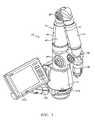 Preferably, each short joint18,32 and36 is constructed of cast and/or machined aluminum components or alternatively, lightweight stiff alloy or composite. Each long joint16,30 and34 is preferably constructed of cast and/or machined aluminum, lightweight stiff alloy and/or fiber reinforced polymer. The mechanical axes of the three aforementioned joint pairs (i.e.,pair1 comprisesjoint pairs16,18,pair2 comprisesjoint pairs30,32 andpair3 comprisesjoint pairs34,36) are aligned with respect to the base for smooth, uniform mechanical behavior. The aforementioned tapered construction frombase12 to probe28 is preferred to promote increased stiffness at the base where loads are greater and smaller profile at the probe or handle where unobstructed use is important. As will be discussed in more detail hereinafter, each short joint is associated with aprotective bumper38 on either end thereof and each long probe is covered with aprotective sleeve40 or41. It will be appreciated that the first long joint16 is protected by thebase housing26A, B which provides the same type of protection assleeves40,41 provide for the second and thirdlong joints30,34.