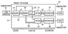 Theproject definition14 inFIG. 1 is a simple example, but has been configured to show at least one example of each of the four types of modules that are recognized in the disclosed embodiments of the present invention. In other words, the disclosed embodiments of the present invention recognize source modules, one example of which appears at21, branch modules, one example of which appears at26, action modules, two examples of which appear at31 and32, and destination modules, two examples of which appear at37 and38. As reflected by the brackets along the bottom ofFIG. 1, branch modules and action modules are sometimes referred to collectively herein as function modules. Source modules deal with the question of where to find the data to be processed, branch modules deal with the question of which data should and should not be processed in a specified manner, action modules deal with the question of what processing should be performed on the data, and destination modules deal with the question of where to put the processed data.