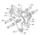 Since the crimp-onconnectors310,312 come into contact with the conductors and theplates102,104, the use of non-conductive materials for the crimp-on connector is desirable from an electrical standpoint because it is important to keep the conductors electrically isolated. If a conductive material is used in the construction of the crimp-onconnectors310,312, then the connection of the conductors to theplates102,104, via the union of the crimp-onconnectors310,312, must be isolated, such as through the use of a non-conductive barrier or sleeve between the crimp-on connector and the hole. For example, a rubber grommet may be used, as will be discussed below in connection withFIG. 9. Alternatively, the plates may be made from a non-conductive material.