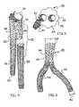 Numerous proposals have been made to address the first of these problems. One common approach is illustrated inFIGS. 4 through 6. In this embodiment, abifurcated endoprosthesis48 is provided that includes atrunk segment50 having a longipsilateral leg52 and a shortcontralateral leg54. Thetrunk segment50 is delivered through the ipsilateral iliac artery and positioned and deployed in place. A separate contralateral leg stent-graft segment56 is then delivered through the contralateral iliac artery and deployed to join to the shortcontralateral leg54 on thetrunk segment50 to complete thebifurcated device48. The completed device is illustrated inFIG. 6.