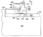 A better understanding of the sliding action of the exemplary quick coupling mechanism can be seen inFIGS. 12–14, which show the simple movements needed to couple and/or decouple the two modules.FIG. 12 shows a close-up partial cross-sectional view of the quick coupling mechanism includinglanding pad510 and hingeassembly400. For clarity in understanding, theupper module220 is omitted, but would be rigidly mounted to hingeassembly400 as shown inFIG. 9.