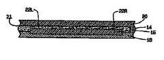 Referring toFIG. 2aonce the lemma withrelease agent12 is removed, the three remaininglayers14,16,18, act as a single unit and are adhered, for example, to the bottom21 of apaper business form20. Referring toFIG. 2b, fivelayers14,15,15.5,16, and18 act as a single unit. As shown inFIG. 2a, the patch then consists of four layers: apaper base layer20 having aperipheral edge20′, apermanent adhesive14, abreakaway layer16 having aperipheral edge16′, and aprimary film layer18 having aperipheral edge18′. As shown inFIG. 2b, the patch consists of six layers: apaper base layer20 having aperipheral edge20′, a firstadhesive layer14, asecondary fun layer15, a second adhesive layer15.5, abreakaway layer16 having aperipheral edge16′, and aprimary film layer18 having aperipheral edge18′. The first four layers are then die cut at22L and22R in bothFIGS. 2aand2b, through to the bottom of thebreakaway layer16 Related, opposed, parallel die cuts (not shown) are simultaneously cut into thepatch10 so as to form the desired geometric shape; in this case a rectangle with rounded corners to form the card C. Theprimary film layer18 is not cut and is left attached to the bottom21 of thepaper base layer20.