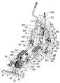 Referring toFIGS. 4 and 5, when a smaller elliptical motion is desired by the user during exercise, themotor41 is actuated through an operating panel (not shown) mounted on thefront support12 of the support frame1 so as to rotate thescrew rod442 so that thesleeve441 can move upwardly and push the cross member43 (seeFIG. 1) upwardly along theguide rods421 of thepositioning frame42. The rockingarms51, at the same time, slide upwardly through the respective pairs of therollers533 so that the distance of the pivot axis (B) from the synchronizingmembers53 is increased. In other words, the pivot axis (B) moves away from the synchronizingmembers53. In this situation, the swinging amplitude (L2) of the rockingarms51 is reduced, thereby producing a smaller elliptical motion.