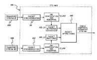 Alternatively, the clock recovery function can be include in the DTS mux for the primary stream. This is not shown inFIG. 5, but would be an addition to the PID filtering function. A clock recovery unit would be based on an STC counter to be compared with extracted PCRs coming from the designed PCR PID. The PCR PID can be from either transport stream. The clock recovery unit can then output PWM control over a VCXO controlled oscillator based, e.g., at 27 Mhz that is used for clocking the STC. Given that the clock is recovered in the DTS mux directly, there is no requirement to preserve a constant delay for data passing through the function. As a result, the unwanted PIDs that are identified through the PID re-mapping do not need to be replaced with null packets or any other means of delineating packet boundaries. Only the packets of interest need to be multiplexed and there is no need to preserve packet times associated with unwanted packets so the data can be compacted. In this case, the bit rate of the combined transport stream will only be the sum of the bit rates of individual transport streams after removing unwanted packets, which will be less than that of the original transport streams. This allows the DTS mux to multiplex transport streams that have an aggregate bit rate that exceeds the maximum input rate of the transport demultiplexor as long as the combined rate of only the PIDs of interest is still less than the maximum input rate.