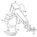As shown, the outer end of thepreferred end effector36 is generally y-shaped with spaced apartfingers40 and42.End effector36 is generally provided with any suitable mechanism(s) (not shown) that allowend effector36 to releasably engage wafers for pick up, transfer, and drop off. Any suitable mechanism that provides such releasable engagement may be used. Examples include edge gripping mechanism(s), vacuum engaging mechanism(s), mechanism(s) that operate in whole or in part via the bernoulli effect, combinations of these, and the like. Edge gripping mechanisms provide excellent control over wafer engagement in a wide range of wafer orientations and are preferred.