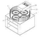 SUMMARY OF THE INVENTIONAccordingly, the present invention provides for a cooking apparatus comprising a horizontal, rotatable, circular turntable cooking surface, sized to support and cook several items simultaneously. The surface should be sized so that the items to be cooked should fit within the distance from the perimeter of the turntable to its center, so that several items, such as pizza pies, may be arranged about the center point in a circle. The turntable should preferably be structured to provide constant, even heat throughout its surface. As the oven is open-air, the cooking of the items will be primarily conduction of heat from the surface of the turntable through the bottom of the item. As the items rotate, they will pass under a static radiant heat source located above the turntable. The radiant heat source will thus direct heat towards the top of the item only periodically, i.e. at one point per rotation. This allows the item, such as a pizza, to cook thoroughly from below by way of the cooking surface, while cooking and/or browning the top portion at a different, desired degree. It will be seen that the cooking apparatus of the invention can rely on conduction heat and radiant heat, has the advantage of working in the absence of a dedicated convection heat source, or a closed housing for containing convection heat.