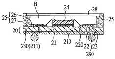 Then, at least onechip24 is mounted on each of thesubstrates20 and within the space B defined by the correspondingdam25. Thechip24 is electrically connected to the correspondingsubstrate20 via a plurality ofbonding wires291 formed on theupper surface210 of thecore21. A plurality ofsolder balls290 are implanted on the exposed terminals orball pads220 on thelower surface212 of thecore21 for each of thesubstrates20.