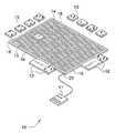 Referring toFIG. 2 in more detail, theassembly10 further includes a plurality ofgame pieces13 selectively positionable onto thegrid15. The plurality ofgame pieces13 include aninterface circuit17 removably attachable to thegrid15 and further include asmart chip19 connected to theinterface circuit15 and for containing data therein. Theinterface circuit17 preferably includes a plurality ofcontacts18 extending downwardly from a bottom surface thereof and that are selectively engageable with thegrid15. Of course, theinterface circuit17 may include alternate methods for transferring data from the plurality ofgame pieces13 to thegrid15. For example, as well known to a person of ordinary skill in the art, such alternate data transfer methods may include one of the following: a radio frequency interface device (not shown), a LED interface device (not shown), an infrared interface device (not shown) or a laser interface device (not shown).