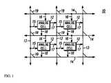 FIG. 1 is a block diagram of a programmable array using NANO-analog electronics in an integrated circuit configuration. NANO-analog array10 includes a plurality of programmableanalog cells12 arranged along a plurality of interconnect channels that form a switching network which includesbus lines13 and14 for routing analog signals. Input and output signals are transferred betweenanalog cells12 andbuses13 and14 by means of analog switching devices such as transmission gates through which analog signals can be transferred with little or no distortion. Control over the switching devices is provided by digital signals that may be stored in a memory such as random access memory (RAM) or read-only memory included in the cell. Alternatively, a centralized memory array can be used to control the switching devices in all of theanalog cells12. As a further alternative, external memory can be used if provision is made for routing the binary control signals to individualanalog cells12. As yet a further alternative, control over the switching devices may be directly provided by other digital circuitry instead of a memory array. Signal routing betweenbus13 andbus14 is provided by switchingdevices19.