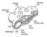 FIG. 7 is a cutaway view of a detachable cassette for which a volume determination can be made, according to an embodiment of the invention. In this embodiment, housing701 containsselectable volume702, which is divided intoair chamber703 andfluid chamber704.Air chamber703 andfluid chamber704 are, in one embodiment, separated by a diaphragm.