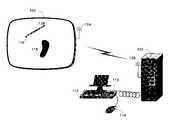 FIG. 1 presents an example of a computing environment with a touch-sensitive display screen. Note that while display screens are used to illustrate this discussion, the present invention is usable with touch-sensitive screens whether or not those screens also incorporate a display. InFIG. 1, a portable, interactive display device or “tablet”100 communicates with ahost computing device102 via a wireless communications channel, here illustrated by aradio antenna104 on theportable tablet100 and by anotherantenna106 on thehost102. By means of its touch screen, theportable tablet100 presents to its user a graphical user interface of thehost102. The user sends input to thehost102 by touching the touch screen with astylus108 or with a finger. Theportable tablet100 may support other input and output peripherals (not shown) including a mouse, speaker, camera, and the like. Theportable tablet100 is of the type disclosed in U.S. patent application Ser. No. 09/784,716, “Methods and Systems for a Portable, Interactive Display Device for Use with a Computer,” which is incorporated herein by reference in its entirety.