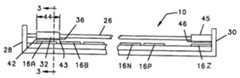 DETAILED DESCRIPTION OF PREFERRED EMBODIMENTSReferring toFIGS. 1,2, and3, alinear position sensor10 includes a generallyplanar body12 having an electricallynonconductive insulator14 on the upper surface thereof, and mounted linearly along theupper surface14 are a plurality of spaced electricallyconductive plates16A,16B, . . .16N, . . .16Z with each plate having a planar upper surface. The planar upper surfaces of all theplates16A,16B . . .16N, . . .16Z define the segments of the same plane. Each plate, of whichplate16N is representative of all such plates, is rectangularly shaped with parallelopposing ends17,18 that define awidth19, and parallelopposing sides20,21 that define a length22. Also, as depicted inFIG. 2, each plate20N has aspacing24 between theends17,18 thereof and the ends of theadjacent plate16P.