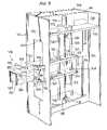 As seen inFIGS. 13,14,16 and17, a fitting530 is secured by screws to plate296 and supports aproximity sensor532.Proximity sensor532 cooperates with atarget534, which is fixed by screws to the inner surface ofportion360 of drivenpulley356.Target534 is formed of a suitable metallic electrically conductive material such as copper. By sensingtarget534,proximity sensor532 is adapted to sense the position ofshaft366 and prevent over-travel thereof. In addition, a mechanical stop is provided in case the electrically operatedproximity sensor532 does not operate properly. Referring toFIGS. 13 and 16, in case of such failure ofsensor532, for limiting the forward pivoting direction of first dependingarm372,edge375 of first dependingarm372 contacts edge299 ofcross member298, which is mounted betweenplates294 and296 onhorizontal arm290, so as to limit over-travel of first dependingarm372. Referring toFIGS. 13 and 18, for limiting the rearward pivoting direction of first dependingarm372,cross member392 of first dependingarm372contacts end surface301 ofmember297, which is bolted to crossmember298, so as to limit over-travel of first dependingarm372.