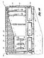 Referring now toFIGS. 15 and 16, acabinet300 having arear access door302 is illustrated. The plurality ofmodule housings200 each support a plurality ofdata storage modules20. In the embodiment shown inFIG. 15, tendata storage modules20 are provided in each of the five illustratedmodule housings200. As will be readily appreciated, eachdata storage module20 in the embodiment illustrated inFIGS. 15 and 16 support fivedisk drives24 so that 250disk drives24 are supported in the cabinet in the modular three-dimensional array five deep, five high, and ten across. Eachmodule housing200 defines a separate cooling air flow path, as previously described with reference toFIGS. 7–14, so that air flows through only a single layer ofdisk drives24 from the time that it is drawn in through the intake vents as described above, including rear intake vents214 through theblower cluster module204 and across thepower supply54.