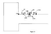 The image intensity is computed at each of thenew evaluation points1102,902 of the newly created segments (Block610). If the threshold intensity of the image at the new evaluation point is not within the deviation distance tolerance limit relative to the target image threshold, the newly created segments are moved away or towards the target image for correction (Block611). The process is then repeated with the new segments A1, A2. At thenew evaluation points1102,902, new image intensity values, gradients and image curvatures are computed. Then the steps fromBlock603 through611 is repeated until the tolerances are met for all sub-segments of the original segment A being evaluated. For example, inFIG. 11, thegradients1152,1154 are obtained fornew evaluation points1102,902 respectively. The resulting fittedcurve1111 has a maximumdeviation distance Dmax1104, and a Pmaxlocated atpoint1106. If Dmaxatpoint1104 exceeds the deviation tolerance, then the sub-segmentation continues until the specified deviation tolerance is met. The resulting mask layout that is output at the end of the inventive method will have additional segments where needed to improve accuracy, but with only marginal increase in computational effort over conventional MBOPC methods.