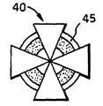 An embodiment of the multipolemode generating element38 is shown inFIG. 5a. Theelement38 has fourtriangular blades41,42,43,44 insertable into the beam path at the pupil plane and which form aMaltese cross40, which is also referred to herein as a Maltese aperture blade (MAB). Each blade has an apex angle β.FIG. 5bshows the illumination intensity distribution resulting from the combination of an annular illumination mode produced by the axicon/zoom module and the MAB. The distribution has four light beams orpoles45. This embodiment enables continuously variable quadrupole illumination modes to be produced. The radial position of each pole can be varied by adjusting the axicon optics, the radial width of each pole can be varied by adjusting the zoom lens, and the tangential pole width can be changed by inserting another set of blades having a different apex angle β, such asMaltese cross40 shown inFIG. 6. By removing the blades altogether, the illumination system can be used for conventional and/or annular modes, again with continuous variation.