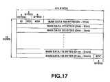 In the embodiment ofFIG. 17, each sector is made up of 12 rows, each row being made up of 172 bytes, thus totalling at 2064 bytes, of which 2048 bytes represent main data. At the leading position of the first of 12 rows, 4-byte ID (identification data), 2-byte IED (ID error detection code) and a 6-byte RSV (spare) are arrayed in this order. A 4-byte error detection code (EDC) is arrayed at the terminal position of the last row.
