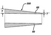As seen inFIGS. 9–11, there is disclosed a novel method for manufacturing a stent which will have variable wall thicknesses. For instance, thestents200,300 ofFIGS. 9 and 11 each contain struts50,60. These struts50,60 are, in typical stents, generally of uniform thickness. What may be desirable is to vary the thickness of thestruts50,60 so as to enhance flexibility of the stent.