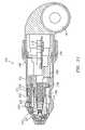 Referring toFIG. 41, an alternative cartridge construction of the type described above is shown at600.Cartridge600 is similar to the cartridge depicted in the foregoing FIGURES (for example, seeFIG. 12) with the primary difference being that the inner and outer bearing races for bearingpairs50,52 have been removed. Thus, theFIG. 41 construction utilizes ashaft602 disposed within ahousing604. Rather than utilizing separate outer bearing races for the proximal and distal bearings as in theFIG. 12 embodiment,housing604 includes appropriate annular recesses (bearing surfaces) to define integral, distal bearing outer races. The distal outer race is defined by the bearingsurface606 formed on the interior surface ofhousing604. Theshaft602, in turn, includes a complimentaryarcuate surface608 formed therein to act as the inner bearing race for the distal bearing. Acylindrical ball retainer610 having selective openings therein is positioned betweenshaft602 andhousing600 so as to retain a plurality ofball bearings612 therein. Thus,ball bearings612 are retained byball retainer610 and rest between thearcuate bearing surface608 ofintegral shaft602 and theannular bearing recess606 ofhousing604. A proximal bearing is formed by using abearing nut614 which is threadably attached to the lower part ofshaft602 to bear against the bottom surface of a bearingspacer616.Bearing spacer616 includes ashoulder617 extending laterally fromshaft602.Bearing nut614 includes anarcuate surface618 which bears against a plurality ofball bearings620 which, like the distal bearing above, will be retained within aball retainer ring610.