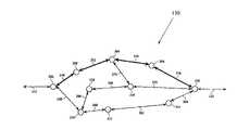 In operation, communication paths within theoptical mesh network130 can occasionally fail. Upon such failures, theoptical mesh network130 can quickly self-repair by establishing new internal communication paths betweenlinks112 and122. The restoration process starts as theoptical mesh network130 detects a problem using fault detection devices at one of the end nodes (not shown) connecting theoptical mesh network130 to one of thedata links112 or122. Upon detection of a problem, theoptical mesh network130 reroutes communication from the failed internal communication path to a new communication path within thenetwork130, thereby restoring communication.