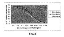 FIG. 8 is a chart representing results of a study according to the invention and showing how the K-identifiability rate changes with a minimum size of exponential padding applied to objects in encrypted Web traffic;