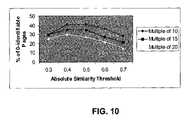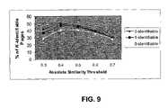 FIG. 9 is a chart representing results of a study according to the invention and showing how a K-identifiability rate varies with the absolute similarity threshold when a number-of-object padding scheme is used as a countermeasure;