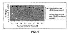 - (3) Actual false positive: given a subsample of target pages T and a non-target page n∉T in the larger sample, n is an actual false positive with respect to T if (1) ∃t∈T for which n is a potential false positive of t, and (2) Sim (n, t)>Sim(n, u) for all u≠t∈T. In other words, a potential false positive n will not result in an actual false-positive decision if n is a potential false positive for more than one target page and the similarity scores are tied (since a detection algorithm tuned to minimize false positives will refuse to identify n as either one of the two plausible candidate target pages). For the set N of non-target pages, if F⊂N is the set of actual false positives with respect to T, then the actual false positive rate of N with respect to T is |F|/|N|*100%.