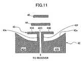 Further, on thecircuit substrate41, there is provided aresonator43 formed of a pair ofconductor patterns43A and43B and having a width of a half wavelength of the electromagnetic wave guided through theslot line42 at a location offset by a distance of a quarter wavelength as measured from theforegoing edge part42alocated on the axis40x, wherein theconductor patterns43A and43B are disposed symmetric about the foregoing axis40xwith a gap of 1/100– 1/10 the wavelength of the foregoing electromagnetic wave.