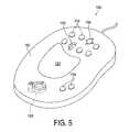 FIG. 5 is a perspective view of anotherembodiment150 of a keyboard device, which can include the haptic functionality of the present invention.Device150 allows a player to provide input to the host computer system with a single hand that rests on the housing of thedevice150 and can manipulate various controls. For example, a user's palm can rest on a raisedcentral portion152 of thedevice150 and the fingertips can select thebuttons154, four- or eight-way hat switch156, and dial158. In one configuration, the user operates thedevice150 with his or her left hand, and operates a different device such as a mouse or trackball with his or her right hand (or the devices can be switched places). Thus, thedevice150 can replace a standard keyboard for providing input to such applications as games or the like. One example of a control device providing input functions similar todevice150