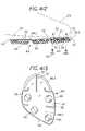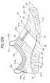 FIG. 14 is a longitudinal cross-sectional medial side view of an alternate article of footwear generally similar to that shown inFIG. 4, with parts broken away, further including a spring guard, and also a rocker sole configuration.