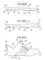 FIG. 23 is a medial side view of an alternate article of footwear generally similar to that shown inFIG. 17, but including a spring element which extends about the heel to form an integral heel counter, and about the lateral side of the forefoot to form a side support, with the outsole and inferior spring element removed, and including track spike elements.
