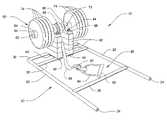 As seen inFIG. 1,frame assembly20 comprises elongatedmembers22 having ends24, parallel and equally spaced apart from each other byelongated cross members26,28, and30.Frame assembly20 serves as a base, and in the preferred embodiment, is laid upon a relatively flat surface having a rug, mat, or other surface having non-sliding characteristics. Mounted uponelongated cross members28 and30 are elevation blocks42. Elevation blocks42 are secured ontoelongated cross members28 and30 withbolts40 and their respective nuts44. In the preferred embodiment, elevation blocks42 have sufficient height to allowweights74 to freely rotate.