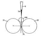 According to the invention, and referring toFIG. 10, prior to an application of a spray coating on the device,gap70, between thefirst roller31 and thesecond roller32 is aligned with thetip71 of thespray nozzle5. Now referring toFIG. 12, which shows a different view of the nozzle and rollers, thetip71 of thespray nozzle5 is aligned with thegap70. Alignment refers to positioning thespray nozzle5 so that the spray ofcoating material90 is directed towards thegap70. As shown, the alignment allows the majority of the spray ofcoating material90 to pass throughgap70. The spray ofcoating material90 is generally directed at thegap70, however, to a limited extent, the spray ofcoating material90 can also come into contact with a portion of thefirst roller31 andsecond roller32.
