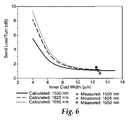 Calculated results of bend loss versus different depressed inner clad thicknesses are shown inFIG. 6. This theoretical calculation was been carried out using a FiberCad program and Beam Propagation Method (BPM) for a fiber bend radius of 5 mm. The depicted exemplary fiber has a +Δ of about 0.0033, a −Δ of about −0.0016, a core radius (rco) of about 5 μm and a varying cladding radius (ric). The bend radius is 5 mm. This figure indicates that suitable bend performance can be achieved for the ratio ric/rco≧3.6. The bend loss will increase at an accelerated rate when the ric/rcoratio decreases. The investigators have further determined that an increase in bend loss is directly related to an increase in MFD when ric/rcois less than 3.6.FIG. 6 also indicates that the error margin between measured bend loss and calculated bend loss is about 0.5 dB/turn.